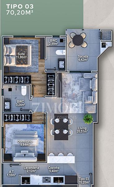 Apartamento na planta, com excelente padrão de aproveitamento de espaços, composto por 01 suíte + 01 dormitório, ideal para morar ou investir. O projeto oferece ambientes bem distribuídos, com área social integrada, proporcionando conforto, funcionalidade e modernidade.